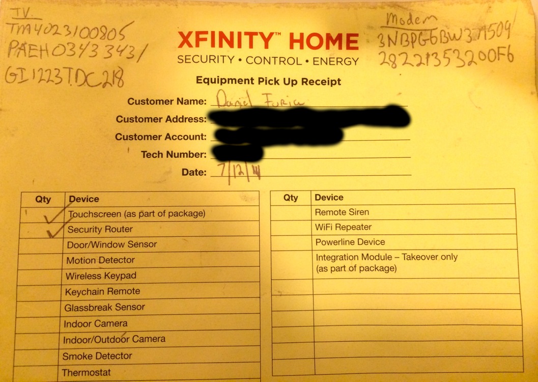 #18. 7/12/14: A Comcast technician came to my home. He accessed my account in order to properly identify and remove all Comcast equipment associated with my account. I asked for and received a signed receipt from the Comcast technician, which included the serial numbers of all the equipment he removed. I recorded the audio of this entire appointment.